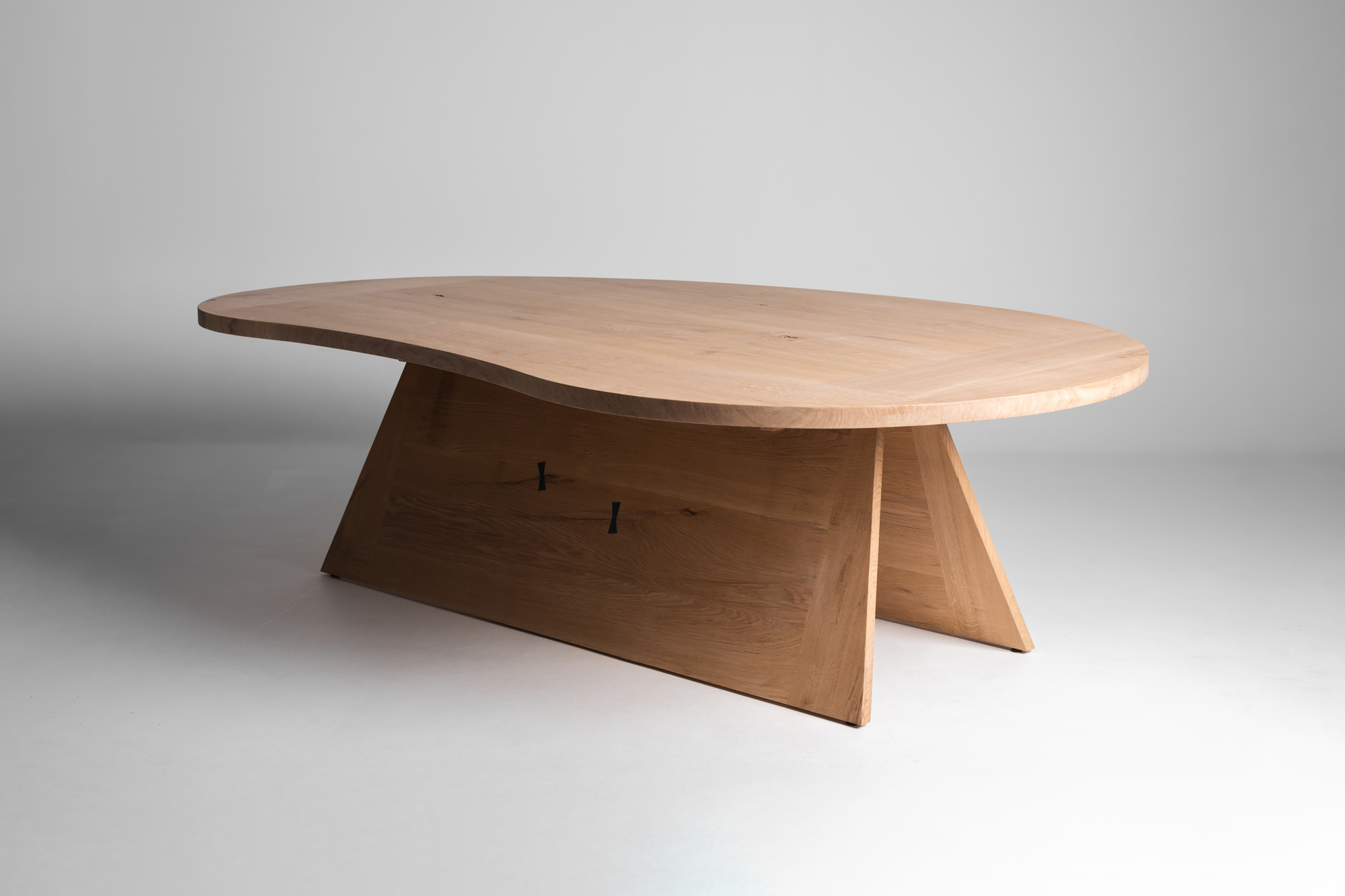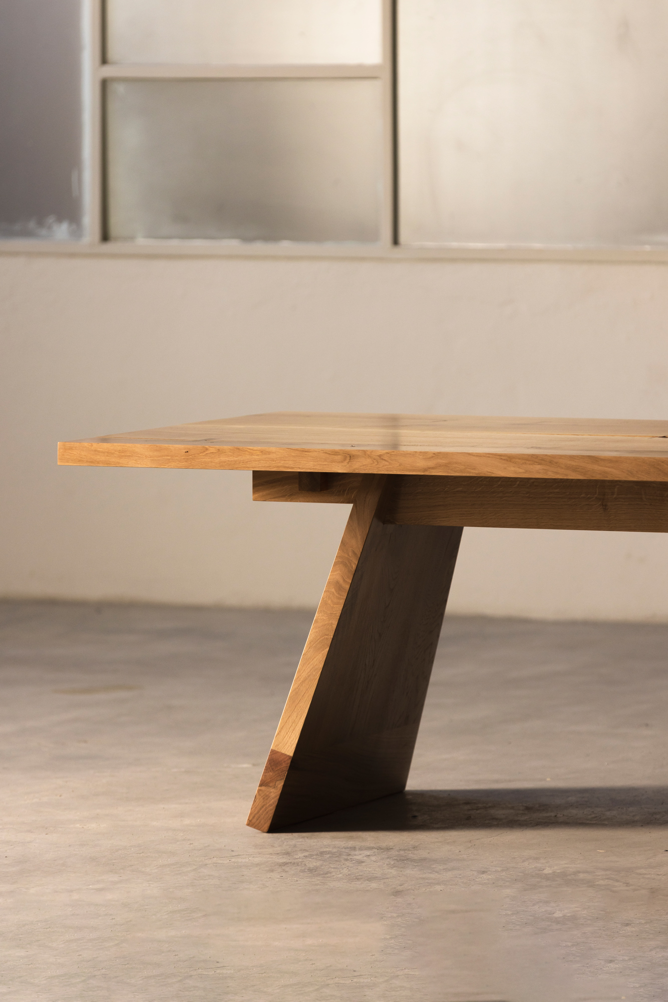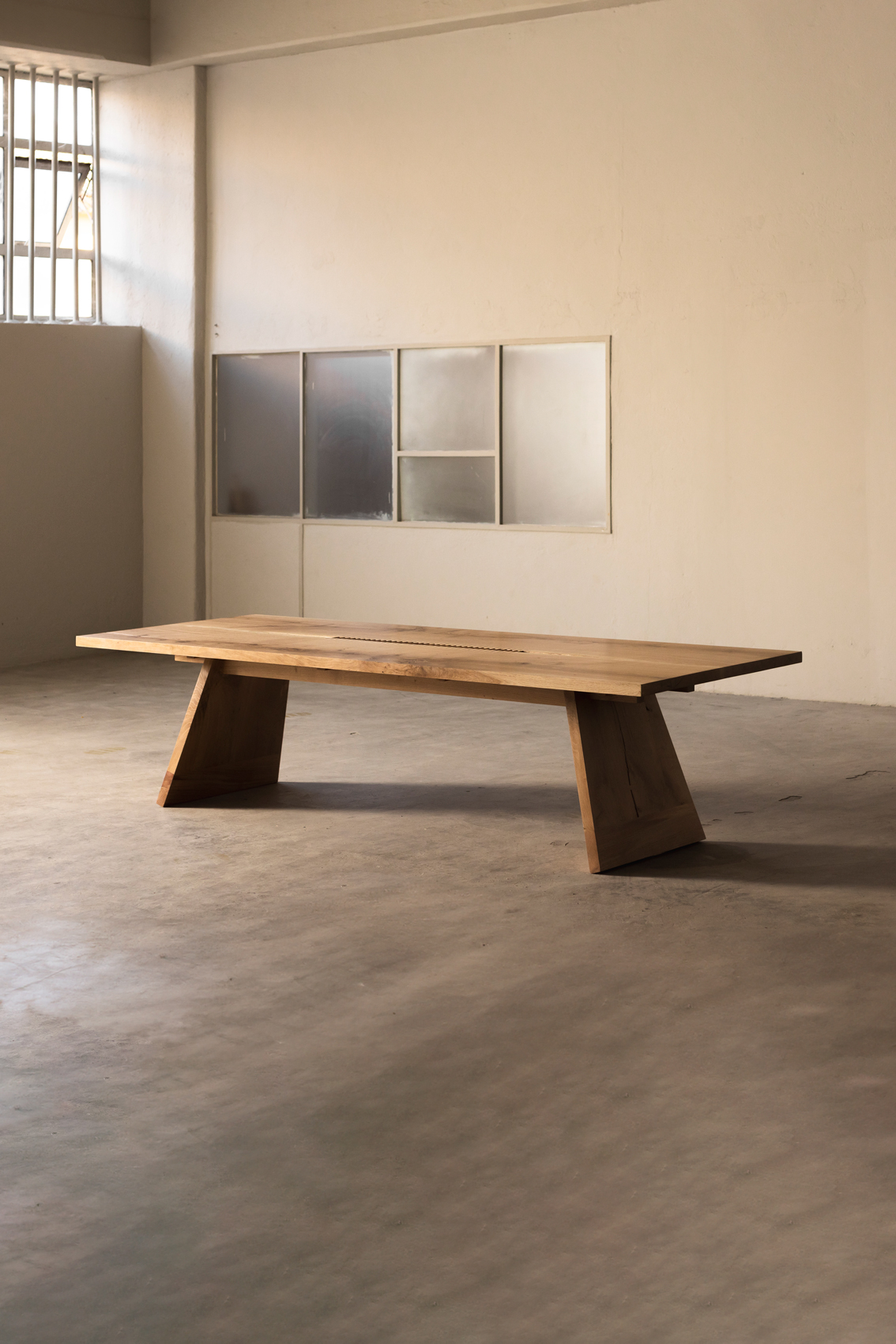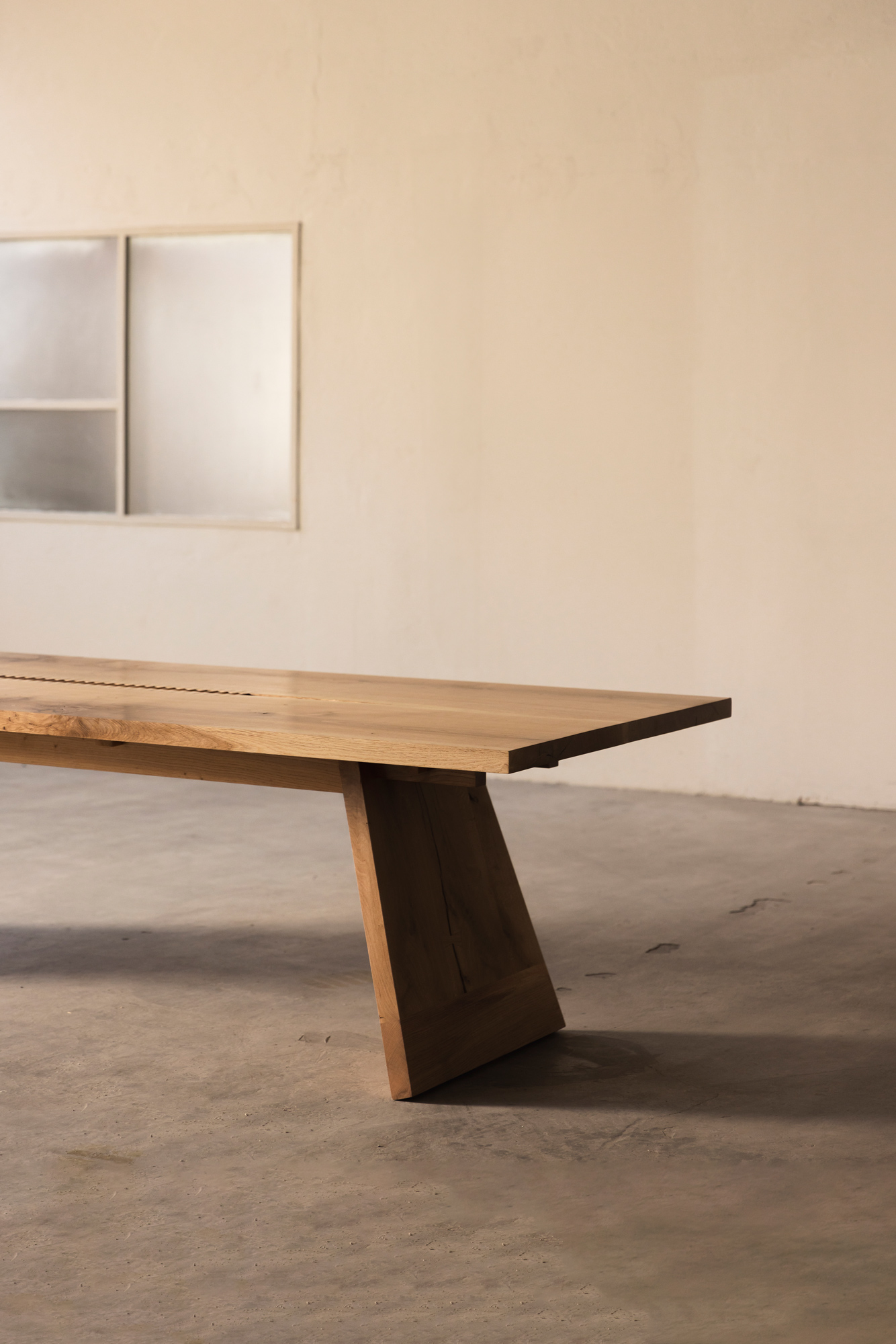 The top is made out of 3 French Oak slabs with two ends prependicular to the grain, to avoid movement and provide stability, with no visible joinery. The inverted V shape base was thought to hold the 200kg top.