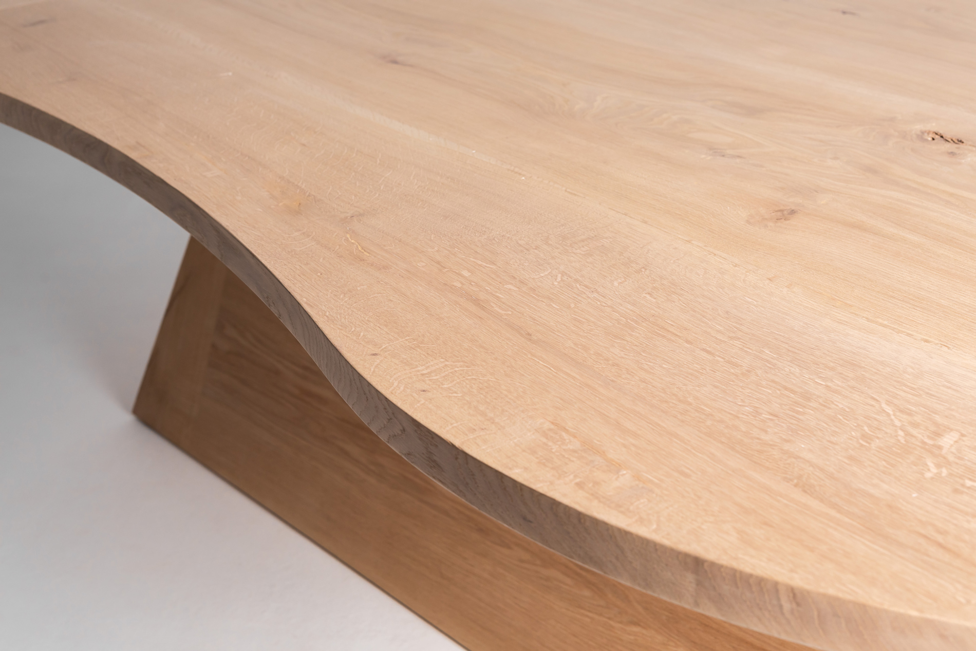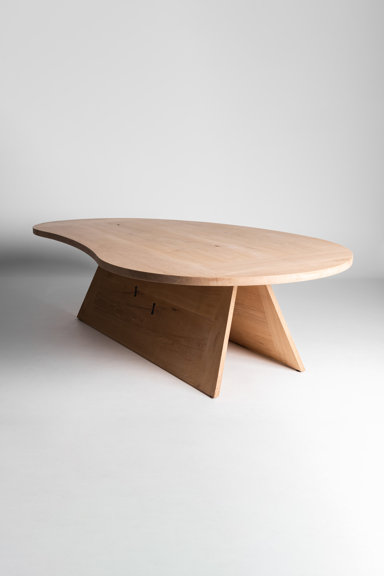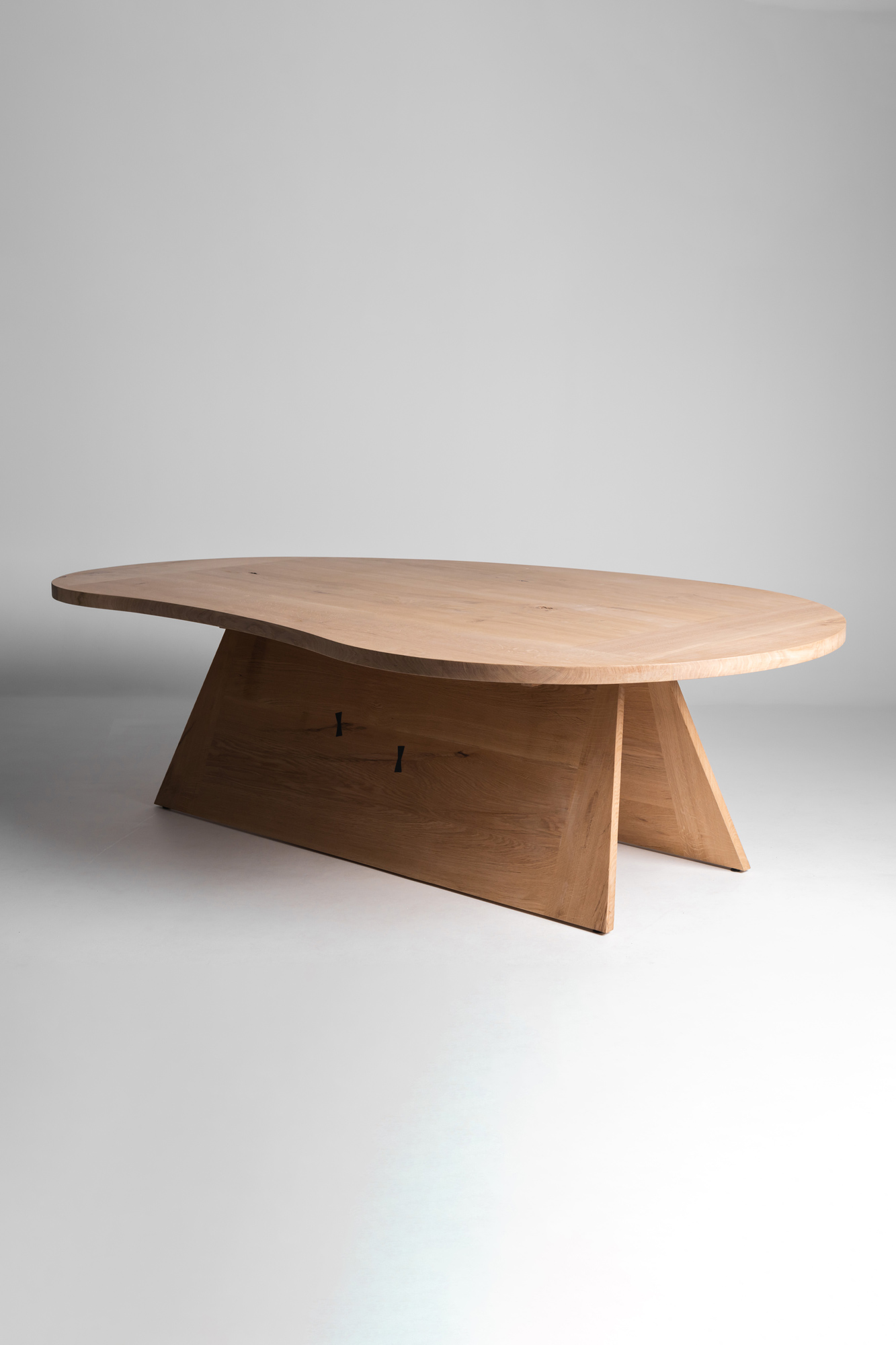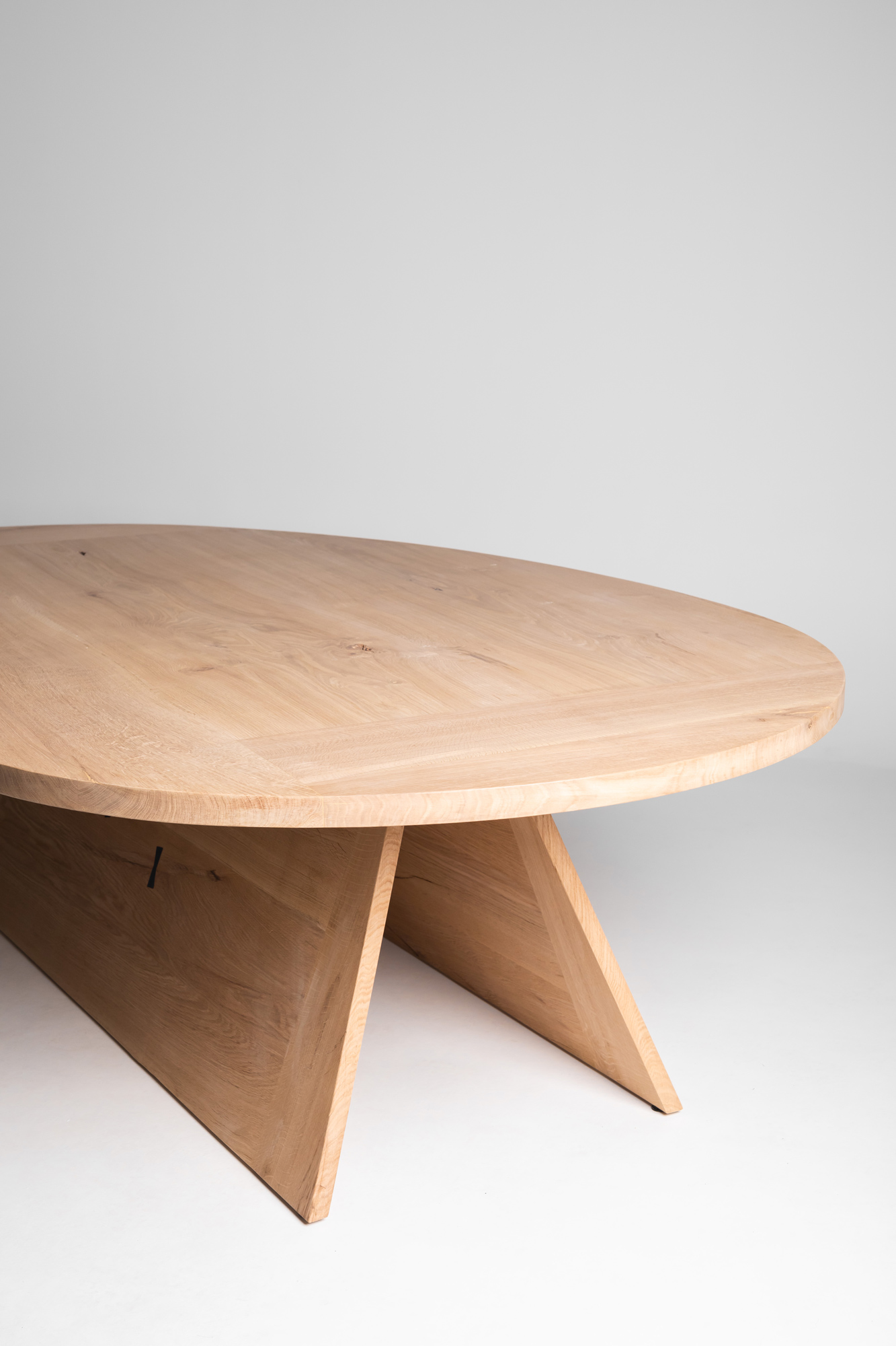 The top is made out of 3 French Oak slabs with two ends prependicular to the grain, to avoid movement and provide stability, with no visible joinery. The inverted V shape base was thought to hold the 200kg top.