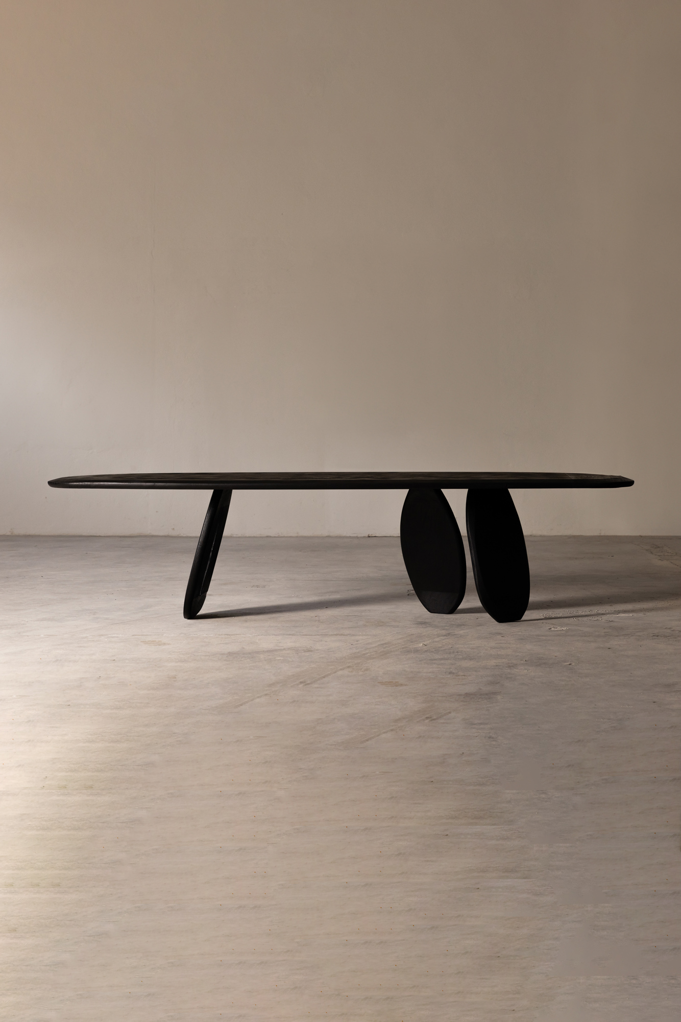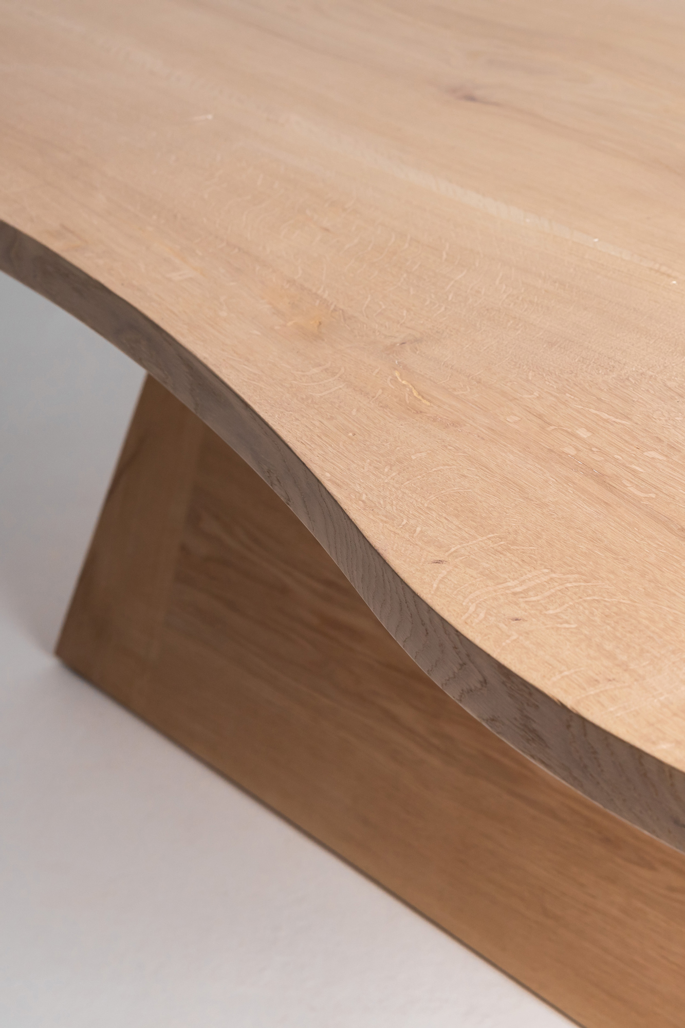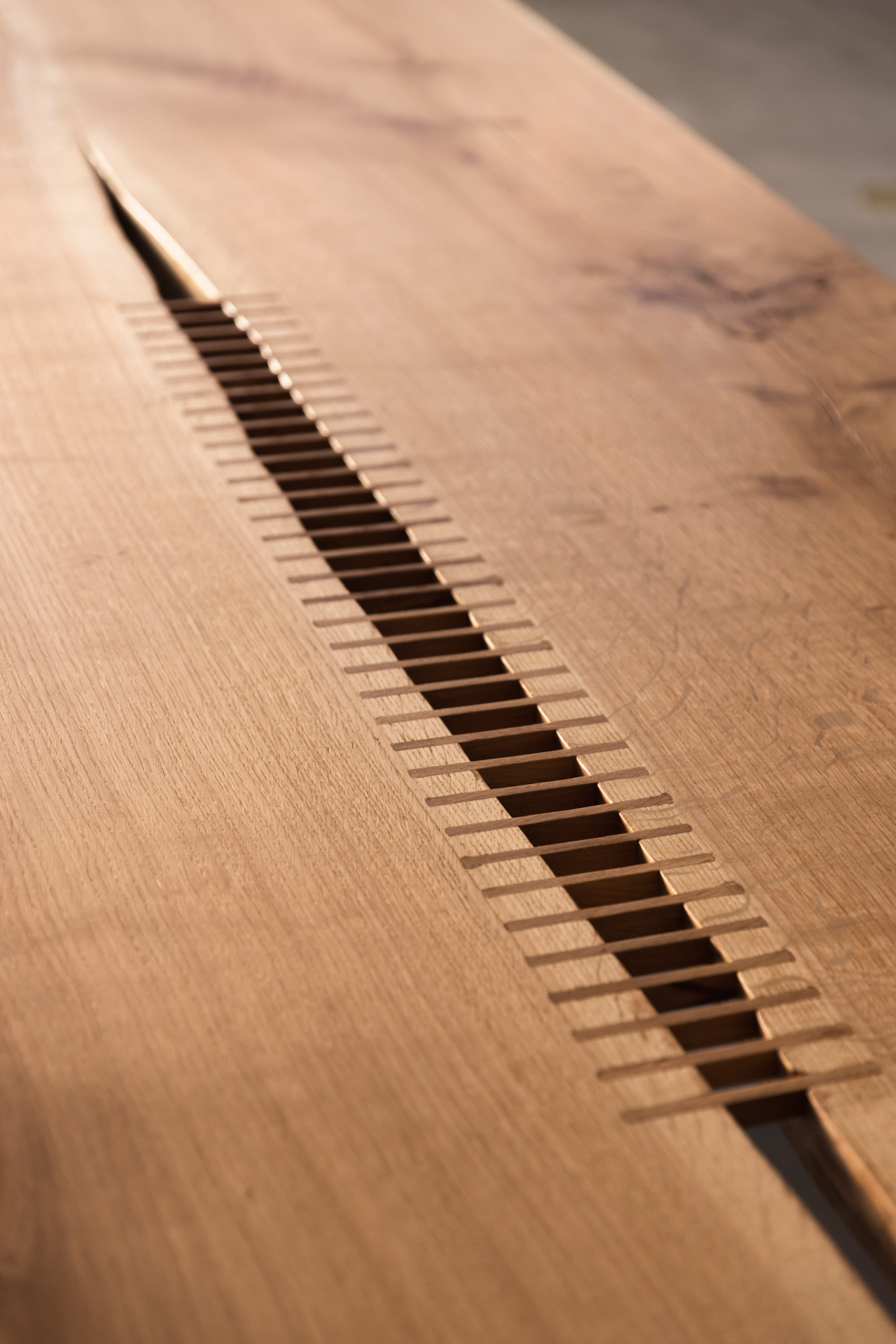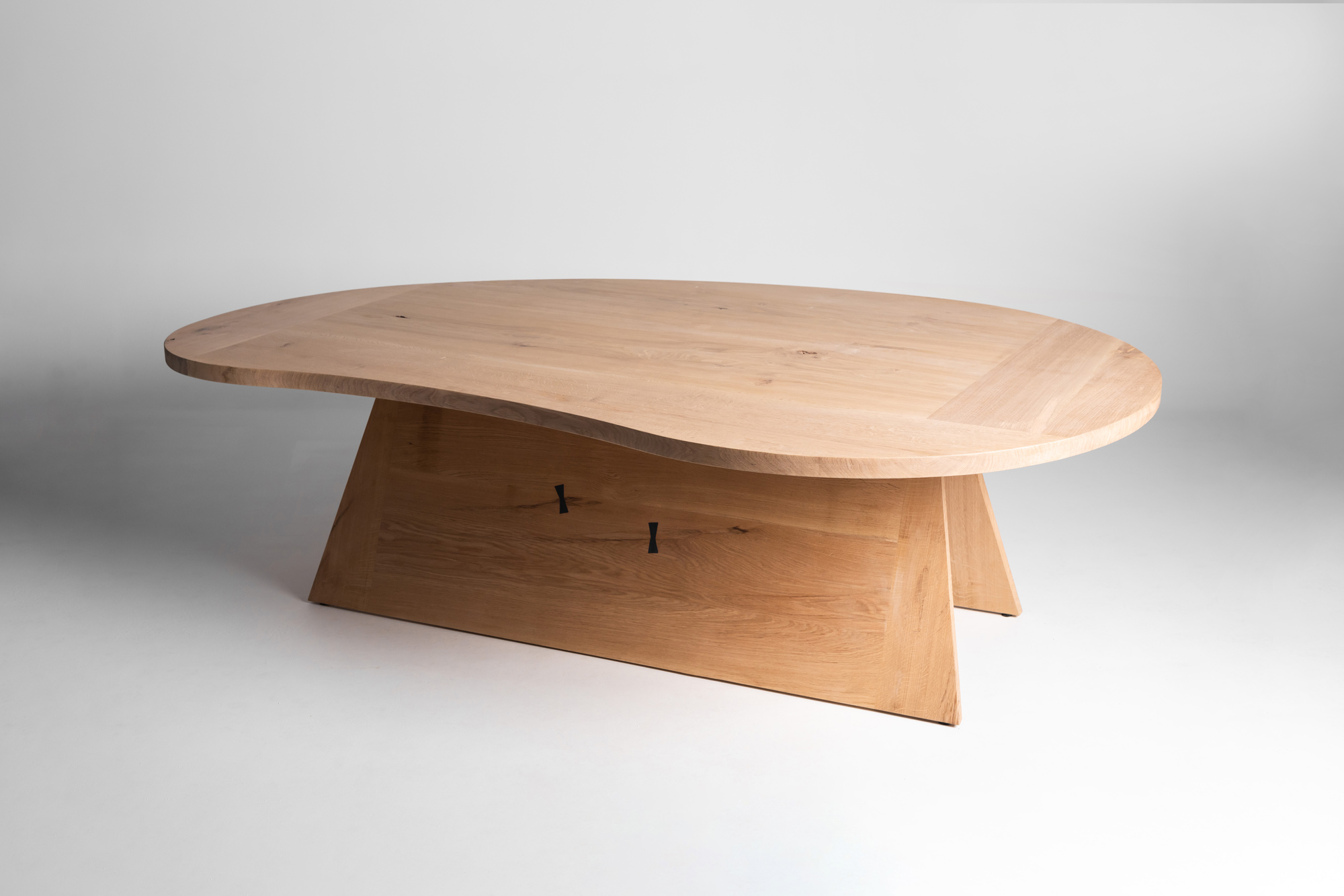 The top is made out of 3 French Oak slabs with two ends prependicular to the grain, to avoid movement and provide stability, with no visible joinery. The inverted V shape base was thought to hold the 200kg top.